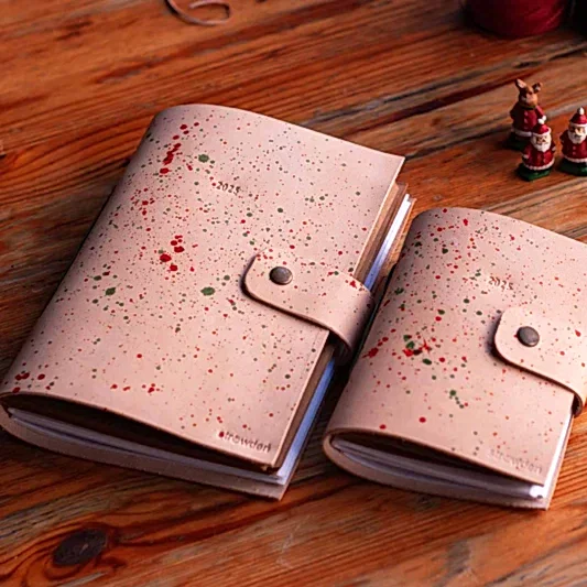 Yılbaşına özel yılbaşı renklerinden tasarladığımız defter modelimiz. Vejetal deriye fırça ile püskürterek deri üzerinde bu renk dokusu elde edilmiştir. Yani her ürünün derisi birbirinden tamamen farklıdır ve size özeldir.